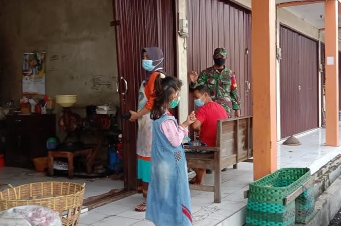 Seperti terlihat kali ini, Sertu Suprapto sedang menyambangi pedagang disekitar pasar tradisional Jaken yang tidak begitu jauh dari lokasi digelarnya kegiatan TMMD Reguler Kodim Pati. Dengan tetap mengepankan humanis ia menghimbau kepada penjual dan pengunjung pasar untuk memakai masker.