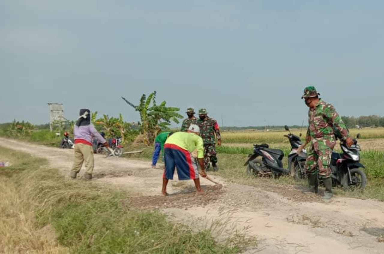 Pati-Satgas TMMD Kodim Pati bersama masyarakat desa Tamansari terus kebut pekerjaan di sasaran pokok TMMD yakni melanjutkan penimbunan jalan dengan material batu dan pasir.