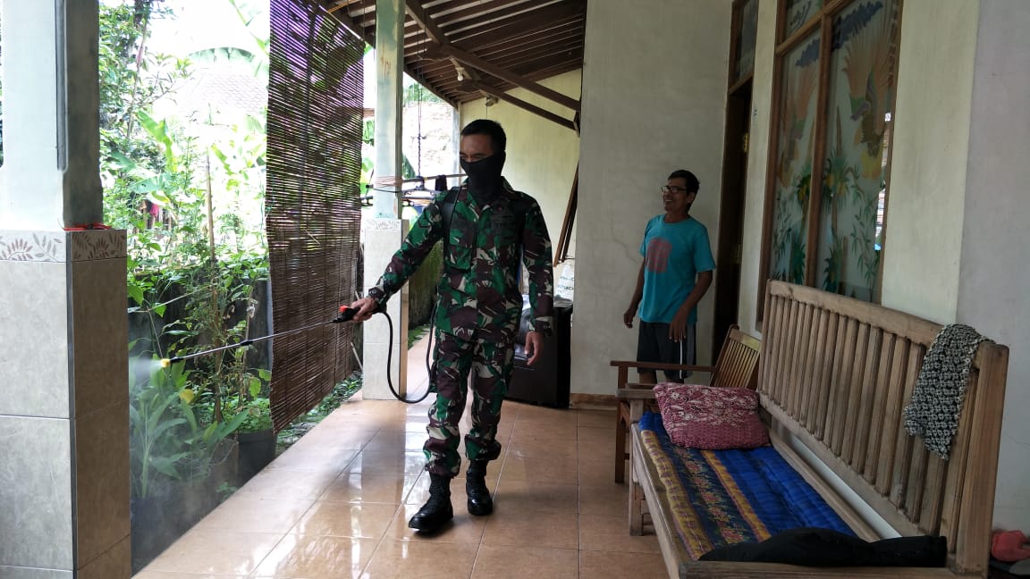 Dalam rangka memutus mata rantai penyebaran virus Covid-19 di wilayah Desa Tamansari, Kecamatan Jaken, anggota Satgas TMMD secara rutin melaksanakan kegiatan penyemprotan cairan disinfektan di rumah-rumah warga setempat. Seperti yang dilakukan Serda Sukarji salah satu anggota Satgas TMMD, terlihat sedang melakukan penyemprotan cairan disinfektan di rumah Bapak Sunarli (54) warga Dukuh Pandahan, Desa, Tamansari, Kecamatan Jaken, Kamis (08/7/2021).