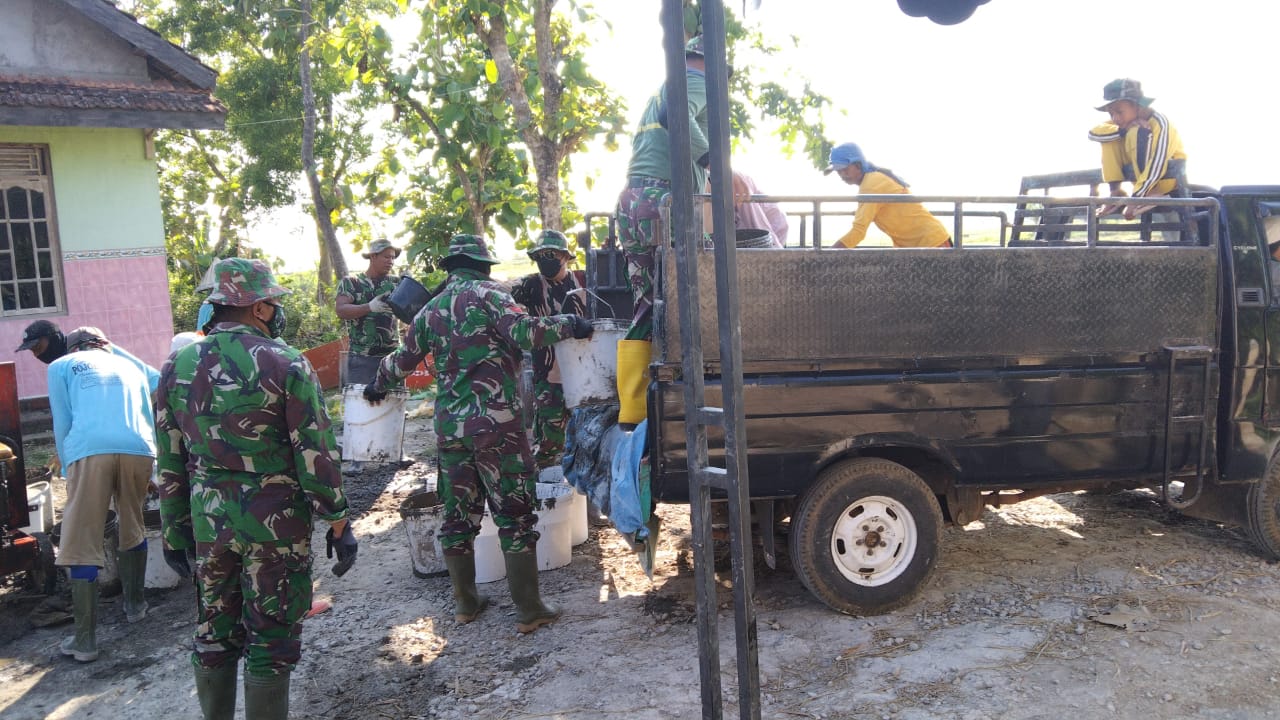 Pati — Guna mensukseskan kegiatan TMMD Reguler ke 111 Kodim 0718/Pati gunakan mesin molen beton untuk percepat pengecoran jalan rabat beton sepanjang 1.450 meter di Desa Tamansari, Kecamatan Jaken, Kabupaten Pati, Senin (5/07/2021).