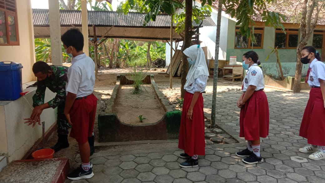Pati – Personil Satgas TNI Manunggal Membangun Desa (TMMD) Reguler ke-111 Kodim 0718/Pati memberikan penyuluhan Protokol Kesehatan (Prokes) kepada murid SDN Tamansari di Desa Tamansari, Kecamatan Jaken, Kabupaten Pati. Penyuluhan ini untuk memutus mata rantai penyebaran Covid-19.