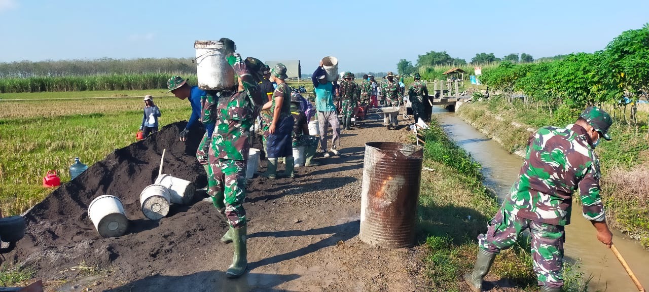 Pati –Pembangunan jalan penghubung amtara Desa tamansari dan Desa Sumberarum Kec.Jaken Kab. Pati sampai dengan saat ini masih berlangsung Para Satgas TMMD beserta masyarakat sangat bersemangat dalam melaksanakan proses pengerjaan pembikinan jalan beton dengandengan di bantu alat angkong dan mesin Molen selain cangkul dan alat lainnya menambah kemudahan dalam pengerjaannya dan penghematan waktu., Senin(28/06/2021).