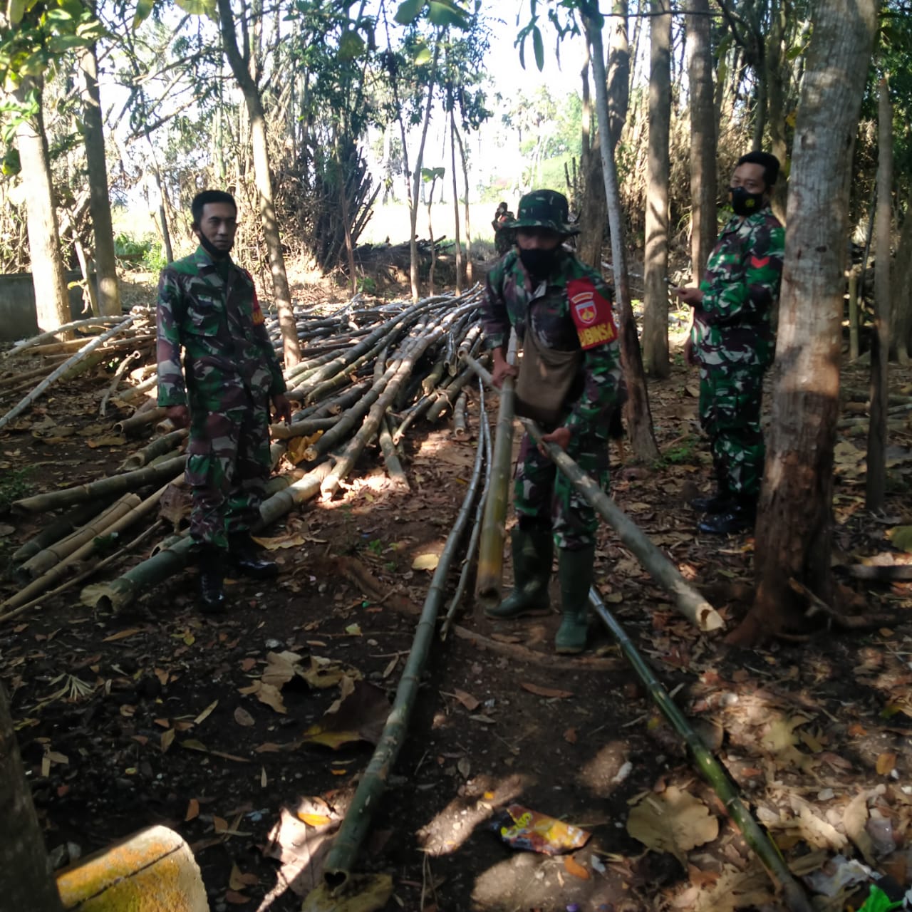 Sebagian batang bambu dipotong sama panjangnya , dirapikan kemudian dikumpulkan untuk dibawa ke lokasi upacara simbolis penyerahan alat peralatan yang akan digunakan saat TMMD kepada perwakilan satgas TMMD.