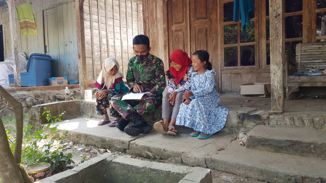 Pati – Guna menumbuhkan wawasan kebangsaan kepada anak-anak di Desa Tamansari, Kecamatan Jaken, Kabupaten Pati, Serda Sukarji anggota TNI Satgas TMMD Kodim Pati, menyempatkan diri untuk menghampiri dan mengajarkan materi wawasan kebangsaan kepada anak-anak yang saat itu sedang duduk-duduk didepan rumah salah satu warga.