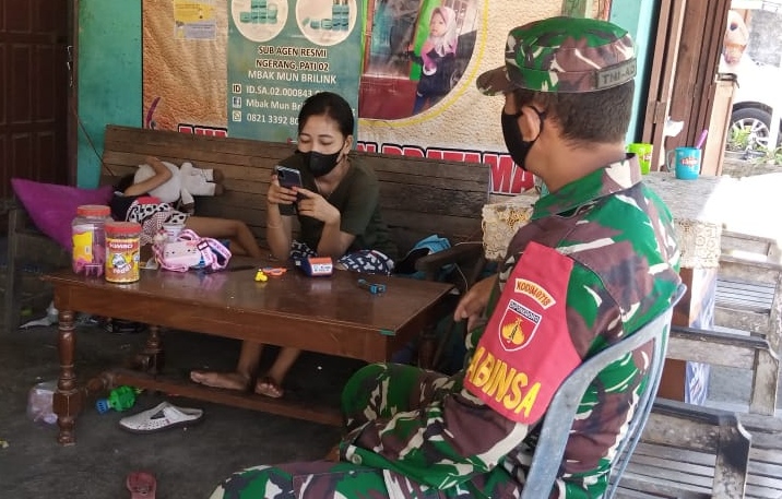 Pati – Kopral Satu Slamet Pujianto anggota Satgas TMMD Reguler ke-111 Kodim 0718/Pati di kala ada waktu senggang disempatkan melakukan kegiatan komunikasi sosial (komsos) dengan warga masyarakat setempat di semua kalangan.