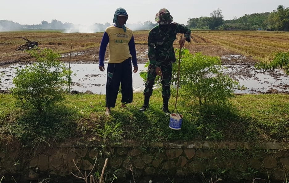 Pati – Disela-sela kesibukannya sebagai anggota Satgas TMMD Reguler ke-111 Kodim Pati, Serda Sukarji menyempatkan membantu bapak Sunaryo (52) warga Dukuh Pandahan RT.02/03, Desa Tamansari, Kecamatan Jaken, Kabupaten Pati, yang sedang menimba air dari sungai untuk keperluan menyiram tanaman cabainya.