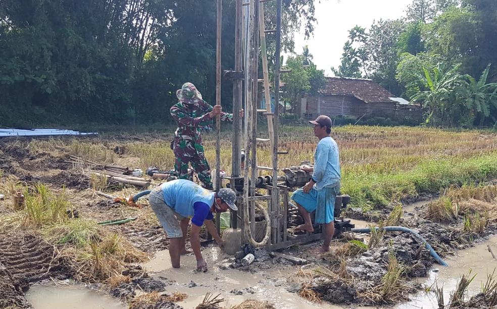 Pati – Anggota Satgas TNI Manunggal Membangun Desa (TMMD) Reguler ke-111 Kodim 0718/Pati, Serda Sukarji membantu Bapak Suwanto (47) warga Dukuh Pandahan, Desa Tamansari, Kecamatan Jaken, Kabupaten Pati yang sedang membuat sumur bor di lahan sawah miliknya, Selasa (13/7/2021).