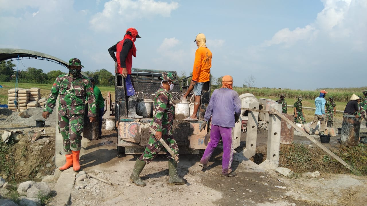 Pati – Kebut sasaran pengecoran jalan area persawahaan dan sekaligus jalan yang menghubungan desa Tamansari degan Sumber Agung, TIM satgas TNI Manunggal Membangun Desa (TMMD) Reg-111 Kodim 0718/Pati dibantu oleh warga menggunakan kendaraan bak terbuka (Pick-up) untuk melangsir adukan material kelokasi pengecoran jalan. Kamis,(24/06/2021).