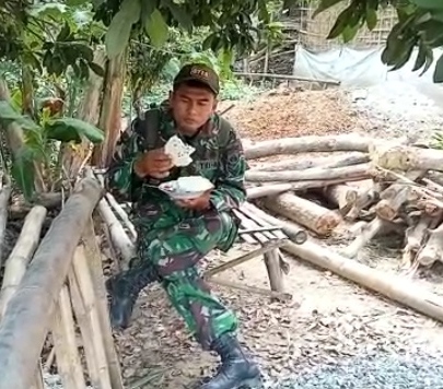 Disisi lain tampak anggota Satgas TMMD yang makan sendirian dibawah pohon jambu milik warga. Dialah Sertu Marmo salah satu TNI personil Satgas yang sedang menikmati menu makanan siang hari ini dengan lahapnya. Walaupun menu yang sangat sederhana, namun dirinya tidak peduli dengan orang sekitarnya, fokus menyantap nasi dan lauk yang ada di piringnya,