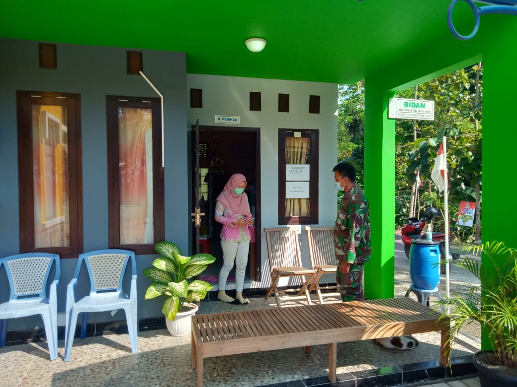 Serda muslimin salah satu anggota satgas TMMD hari ini berkoordinasi dengan bidan desa Tamansari untuk melaksnakan himbauan protokol kesehatan di dukuh Pandahan desa Tamansari.