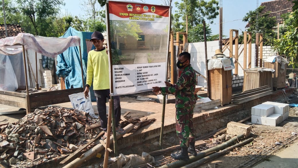 Pati –Satgas Pra TMMD Reguler ke-111 Kodim 0718/Pati besama masyarakat merenovasi Rumah Tidak Layak Huni (RTLH) milik Safari (52) dengan perkembangan 15 persen di Desa Tamansari,Kecamatan Jaken, Kabupaten Pati. sebagai bukti kesungguhan TNI bersama rakyat, implementasinya ada dalam program TNI Manunggal Membangun Desa (TMMD). Bahwa salah satu bukti nyata yang dikerjakan Satgas TMMD bersama masyarakat. Senin (14/06/2021).