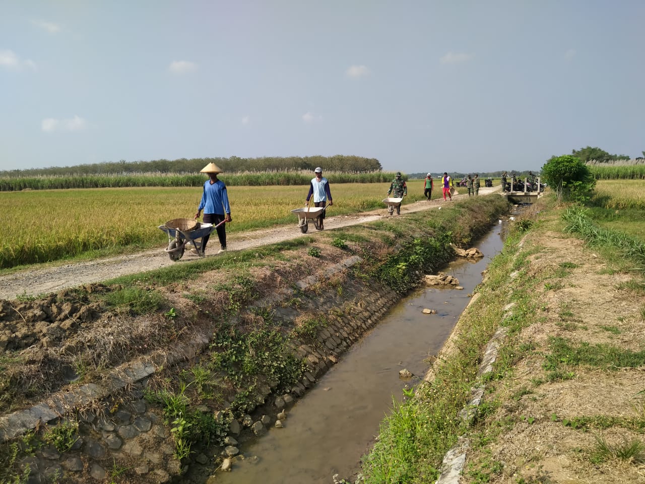 Dengan menggunakan angkong, Gerobak pengangkut material beroda satu itu, anggota TNI dan warga masyarakat beramai ramai, bolak balik mengangkut material untuk meratakan jalanan. Yang mana merupakan jalan penghubung antara 2 desa, Desa Tamansari dan Desa Sumberarum.