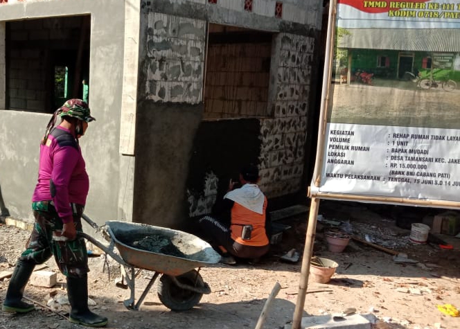 Pati – Warga masyarakat bersama anggota Satuan Tugas (Satgas) TNI Manunggal Membangun Desa (TMMD) Reguler Ke-111 Kodim 0718/Pati, dengan cekatan mengerjakan plester dinding Rumah Tidak Layak Huni milik Mudadi (69), warga Dusun Pandahan Rt.01 Rw.02 Desa Tamansari, Kecamatan Jaken, Kabupaten Pati. Selasa (6/7/2021)