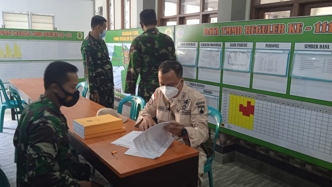 Para tim wasev sedang meneliti produk,buku dan papan informasi yang tersedia di Posko TMMD Reguler Kodim Pati.