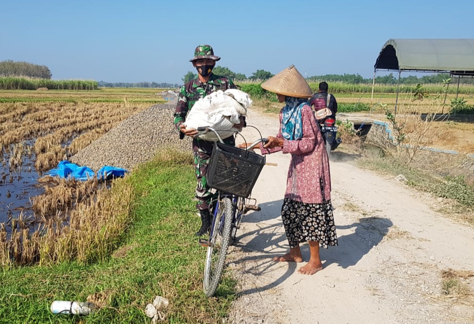 Seperti yang dilakukan Serda Sukarji ketika membantu Ibu Wagini (65) warga Dukuh Kemiri RT.02/02, Desa Tamansari, Kecamatan Jaken, Kabupaten Pati, menurunkan pupuk kandang dari atas sepedanya yang akan digunakan untuk memupuk tanaman kacang hijau, Selasa (15/6/2021).
