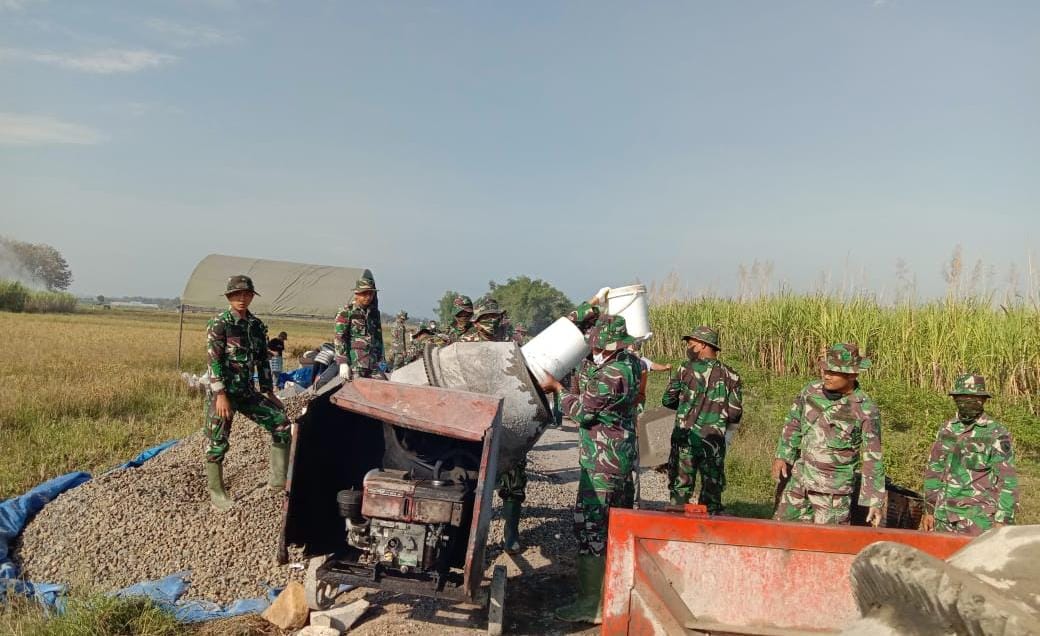 Satgas TNI Manunggal Membangun Desa (TMMD) Kodim 0718/ Pati terus bekerja dengan keras untuk menyelesaikan program pembangunan Penecoran jalan di Desa Tamansari,Kecamatan Jaken, Kabupaten Pati. Kamis (24/06/2021).