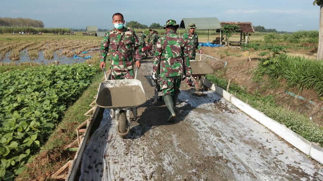 Pati – Aggota Satgas TNI manunggal Membangun Desa (TMMD) bersama warga masyarakat Desa Tamansari terus kebut pekerjaan sasaran fisik rabat beton jalan di Program TMMD Reguler Ke-111 Kodim 0718/Pati. Rabat beton jalan sepanjang 1.450 meter dan lebar 2,6 meter di Desa Tamansari, Kecamatan Jaken, Kabupaten Pati, Selasa (29/6/2021).