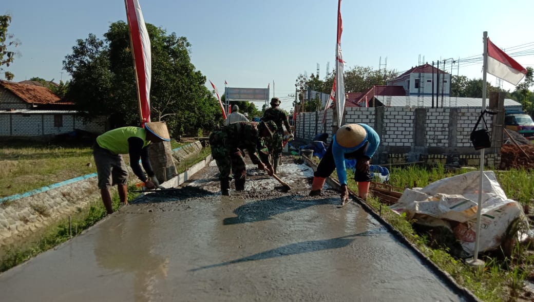 Pati – Rabat beton jalan sasaran fisik program TNI Manunggal Membangun Desa (TMMD) Reguler Ke-111 Kodim 0718/Pati TA.2021 berlokasi di Desa Tamansari, Kecamatan Jaken, Kabupaten Pati hampir selesai. Target semua sasaran fisik RTLH dan rabat beton jalan selesai sebelum penutupan TMMD Reguler Ke-111. Selasa (6/7/2021)