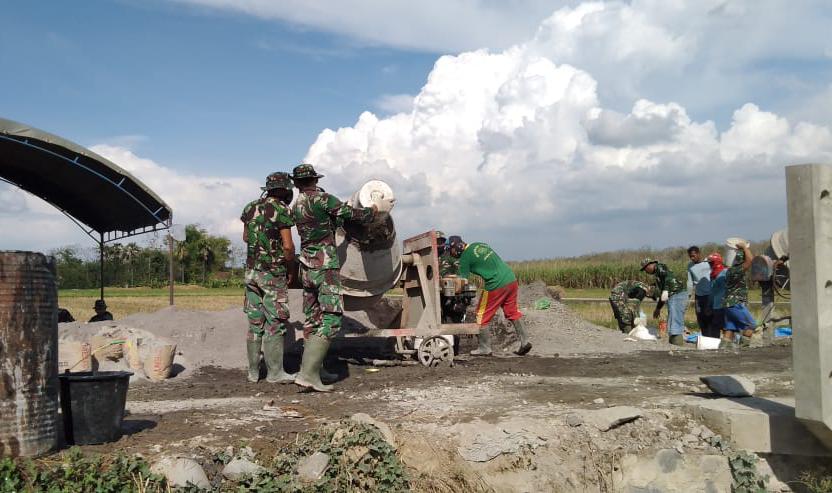 Pati – Anggota Satgas TNI Manunggal Membangun Desa (TMMD) Reguler ke 111 bersama masyarakat Desa Tamansari Kecamatan Jaken, Kabupaten Pati masih melanjutkan bekerja menyelesaikan pengecoran jalan sawah Tamansari,yang memasuki tahap awal, Kamis(24/06)