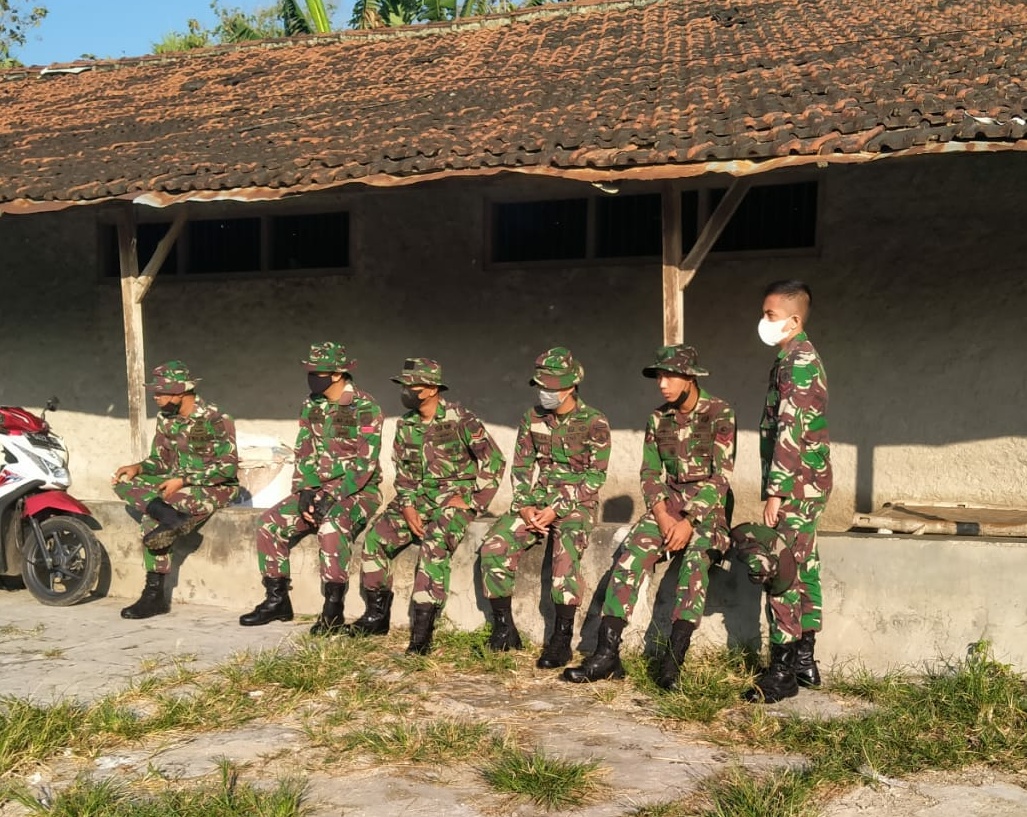 Setelah apel pagi usai, terlihat para personil TNI dengan baju seragam lorengnya, sedang menunggu instruksi lebih lanjut dari Babinsa Desa Tamansari, untuk diarahkan pembagian lokasi sasaran TMMD.