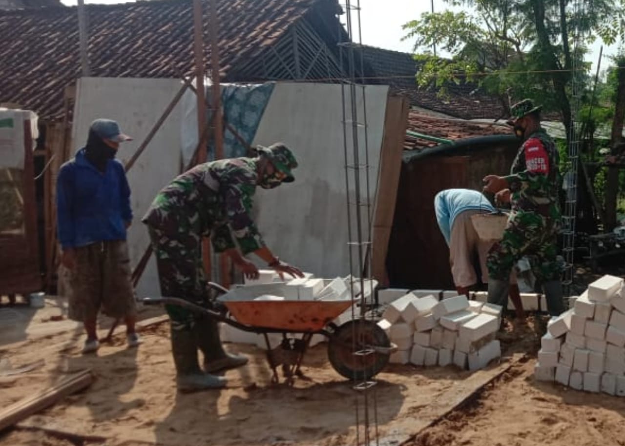 Pati-Rehab rumah tidak layak huni (RTLH) milik Sapari (60) Rt. 1/2 dukuh Pandahan desa Tamansari hari ini mulai pembangunan tembok rumah yang diawali dari sisi kanan dan sisi kiri yang dikerjakan secara bergotong-royong oleh anggota satgas TMMD Kodim Pati bersama tukang dan warga sekitar. Kamis,(10/06/2021).