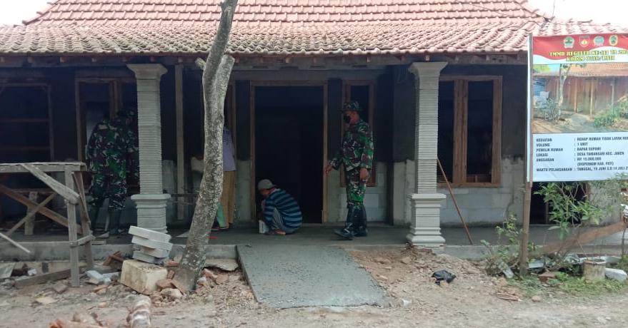 Perwira Seksi Teritorial Kodim 0718/Pati Kapten Inf Kusmiyanto mengatakan, pembangunan rumah tidak layak huni Milik Asmuri (72) warga Dusun Kalimati RT.01 RW.01 yang dikerjakan Satuan Tugas (Satgas) TMMD Reguler Ke-111 Kodim 0718/Pati bersama warga setempat telah mencapai 50 persen. Minggu (27/6/2021)