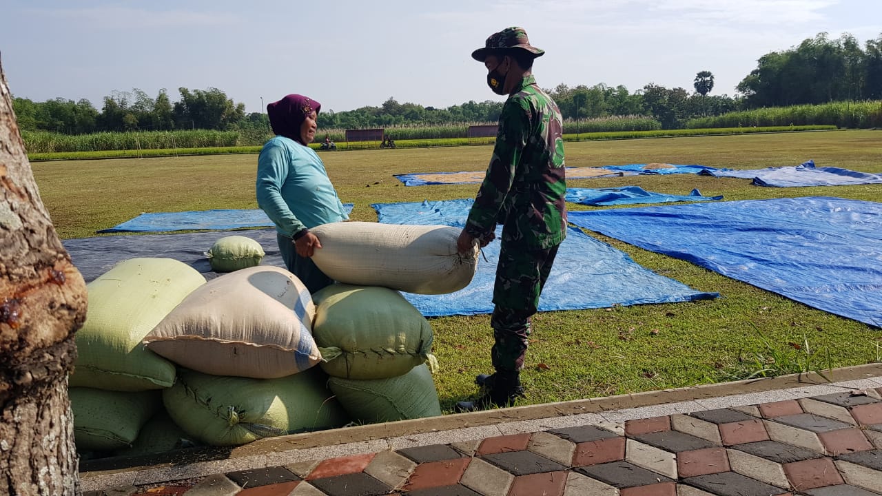 “Saya sedang menunggu suami untuk menjemur gabah, alhamdulillah dibantu bapak TNI soalnya kalo saya angkat karung sendiri pinggang tidak kuat,” tuturnya.