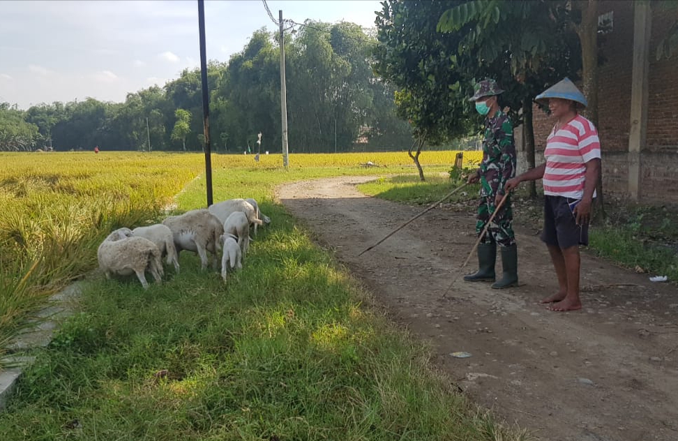 Serda Sukarji anggota Satgas TMMD Reguler Kodim pada sore hari setelah kegitan pengecoran jalan selesai, memyempatkan waktu berkomunikasi dengan Pak Rusman yang sedang menggembala dombanya di pinggir jalan tidak jauh dari lokasi pengecoran jalan sasaran fisik TMMD.