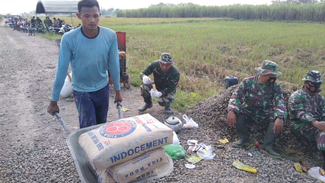 Semangat kerja diperlihatkan salah satu warga Desa Tamansari Rusmanto (35) muat semen pake alat bantu arco sekali angkut tiga sak semen di tumpuk menjadi satu, agar kelihatan tertata rapi, tumpukan semen tersebut untuk kegunaan pelaksanaan sasaran fisik pengecoran jalan, Serda Jamroni melihat sambil mengarahkan tumpukan semen, agar saat digunakan lebih cepat pengambilannya.