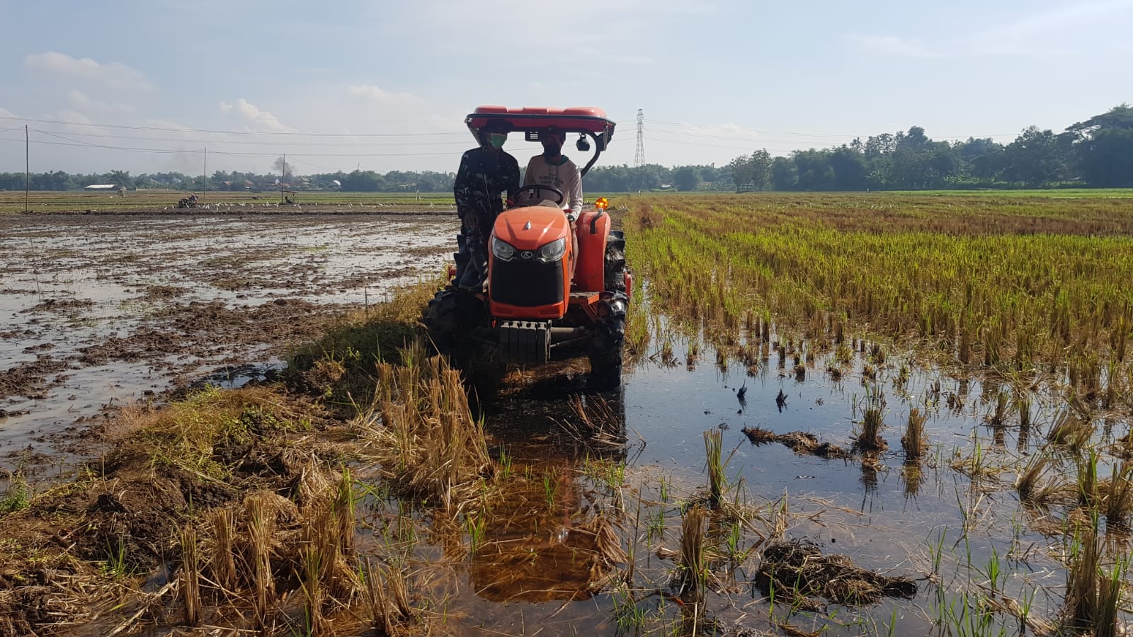 Salah satu aktivitas sebagai ajang belajar bertani bagi anggota satgas adalah membajak sawah dimana Galih (40) warga Dukuh Pandahan, Desa Tamansari saat ini mulai membajak sawahnya.
