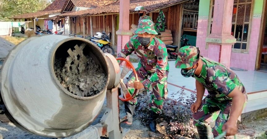 Kabupaten Pati. Untuk mempercepat proses pengecoran rabat beton, ada salah satu anggota Satgas TMMD 111 Kodim 0718/Pati yang mahir