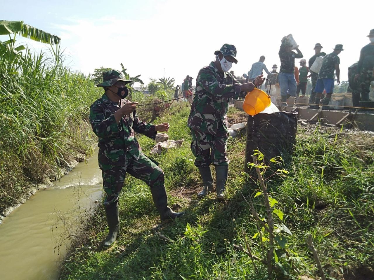 Pati – Anggota satgas TMMD Serma Rusmani dan Sertu Joko, tengah mengambil air dengan menggunakan ember di aliran saluran irigasi di samping pas sasaran pengecoran.