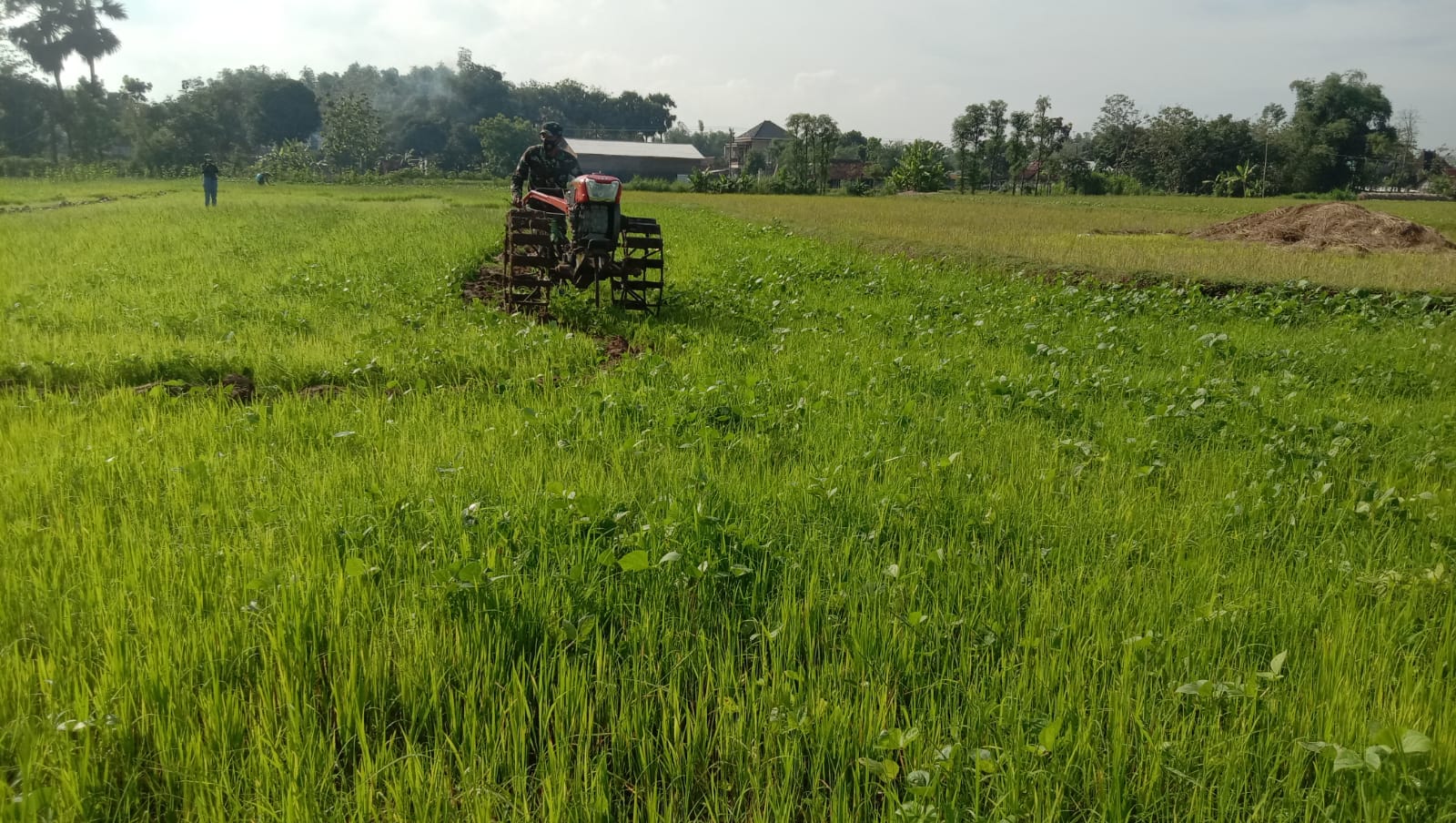 Pemandangan yang tidak seperti biasanya, Serda Arifin terlihat di lokasi dekat dengan pengecoran jalan tampak sedang mengoperasikan mesin traktor (hand traktor) di lahan sawah milik warga