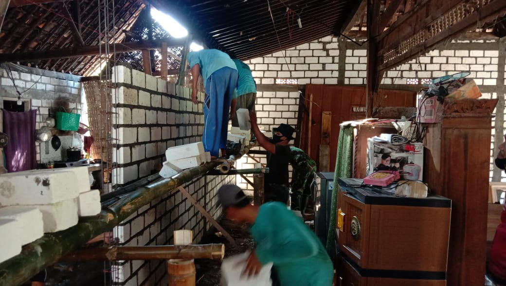 Pati – Rehab Rumah Tidak Layak Huni (RTLH) kepada penerima bantuan rehab rumah yang menjadi program sasaran TMMD Reguler Ke-111 TA.2021 Kodim 0718/Pati. Pekerjaan pemasangan bata di rumah warga yang menjadi penerima RTLH di Dusun Pandahan Desa Tamansari terus dikebut pengerjaannya hingga tepat waktu.