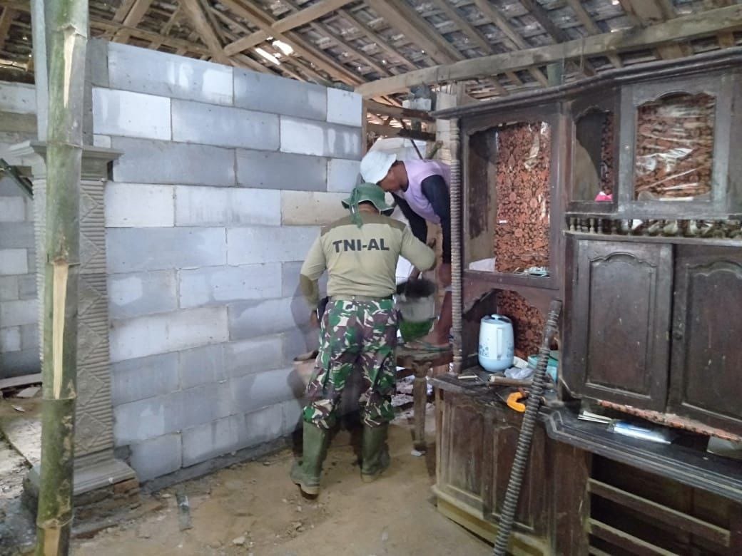 Sertu Mar Sobirin, dari Marinir (TNI AL) yang tergabung dalam satgas TMMD mengatakan, pihaknya dan warga bekerja gotong royong memasang batu bata di rumah Sukandar Rt.04/Rw.02, Desa Tamansari, Kecamatan Jaken, Kabupaten Pati, Selasa (29/06/2021).
