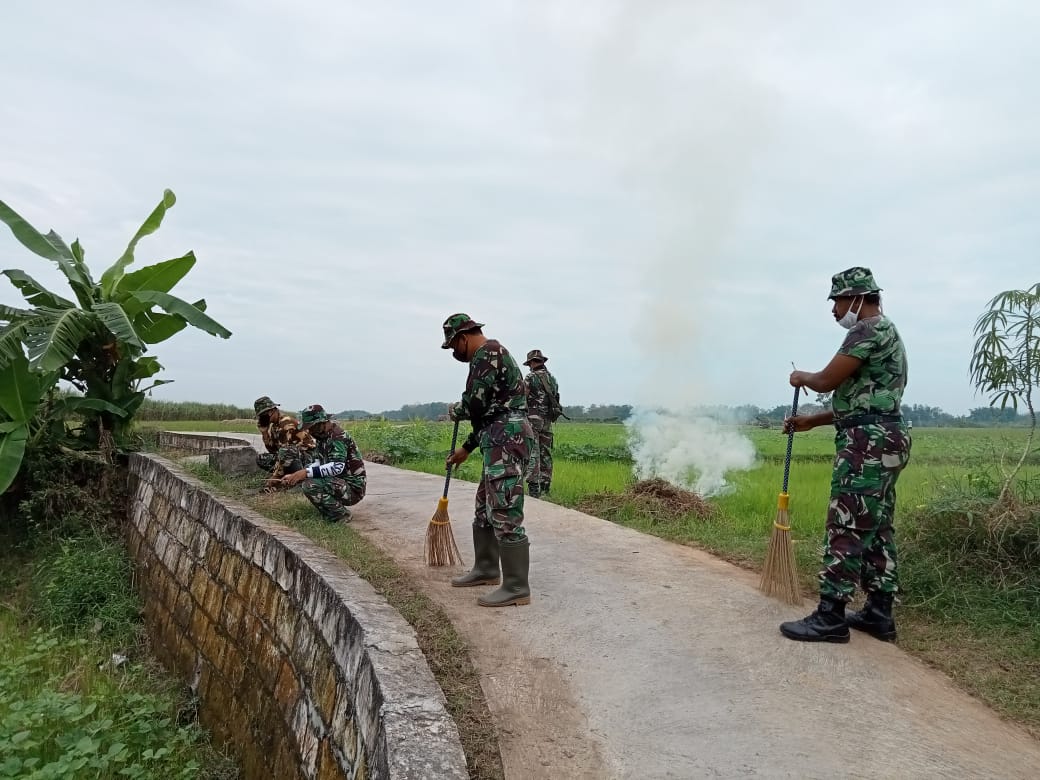 Anggota satgas terlihat menyapu jalan dan membersihkan kanan kiri jalan penghubung desa Tamansari dengan desa Sumberarum kecamatan Jaken.
