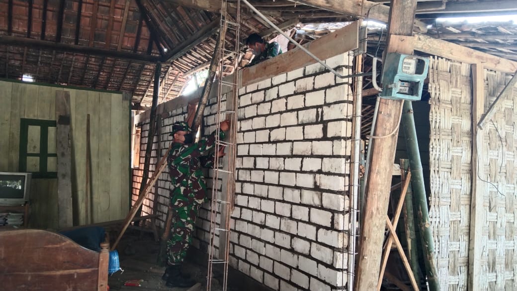 Kegiatan perehapan RTLH, Satgas Pra TMMD dan warga sedang melakukan pemasangan batu putih satu demi satu selanjutnya apabila sudah terpasang akan dilanjutkan dengan sasaran pemasangan kaca kusen jendela maupun pintu