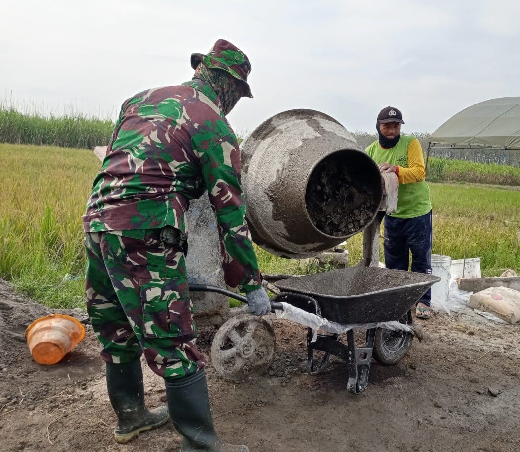 Setelah tertuang dan angkong terisi penuh dengan adukan, Koptu Jumianto pun bergegas pegang