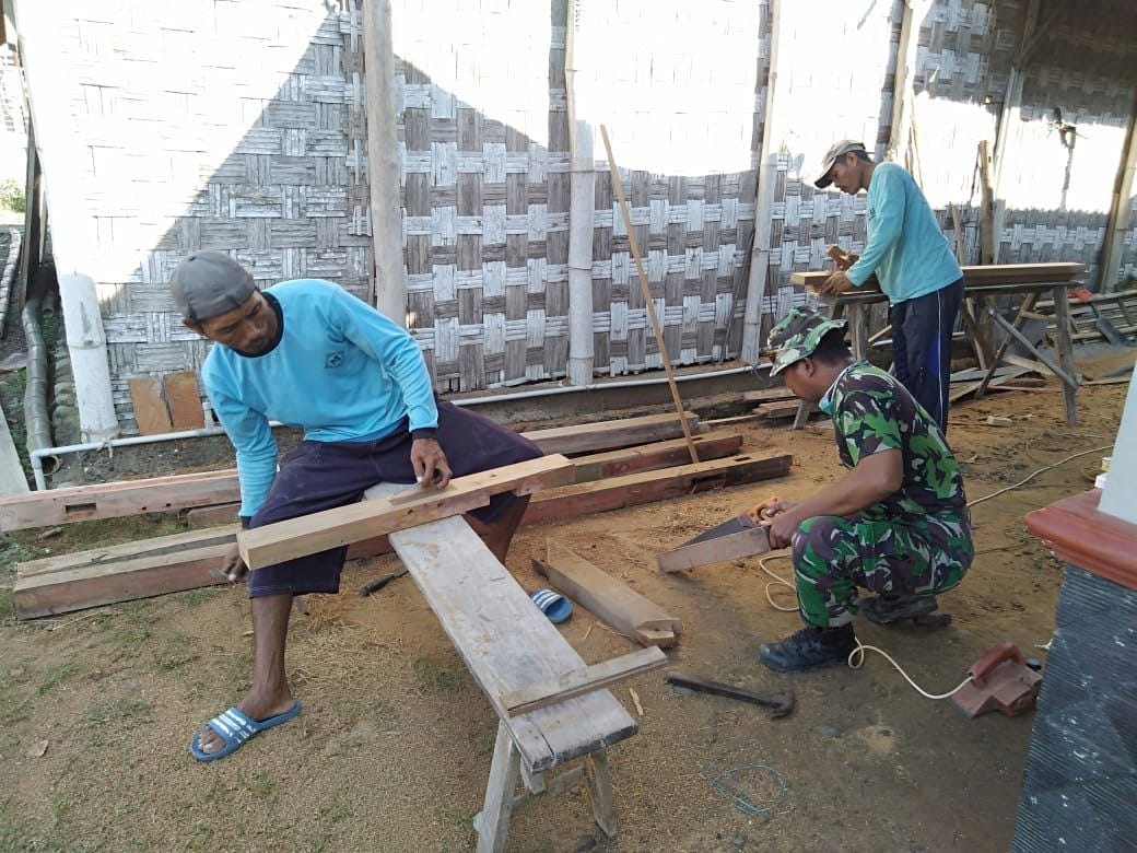 Pagi ini, anggota Satgas TMMD bersama warga sedang melaksanakan menyiapkan dan Menyerut bahan kusen dan jendela rumah milik Bu Sripi.