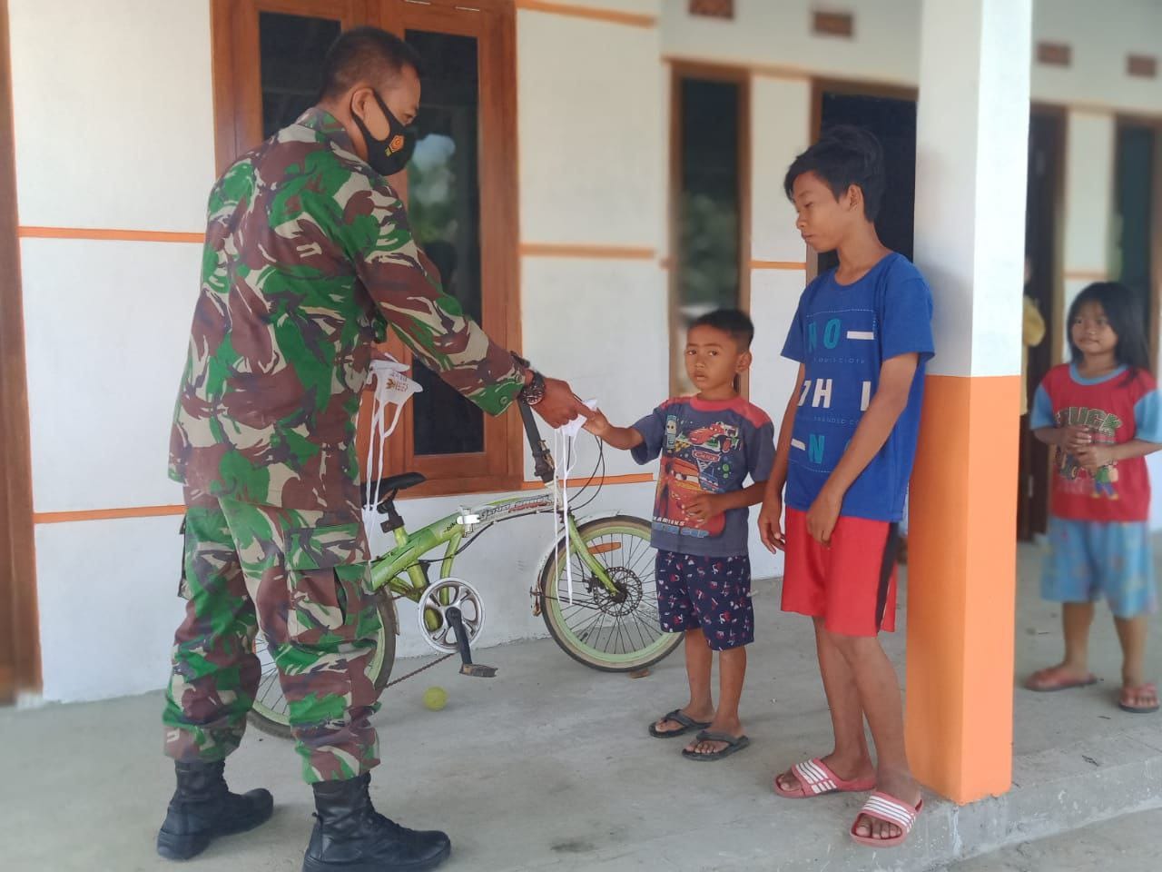 Sebagai upaya pencegahan penularan Covid 19, satgas TMMD Reguler ke 111 Kodim 0718/Pati, membagikan masker kepada anak anak yang sedang bermain bersama, Jum’at 16/07/2021(Pendim).