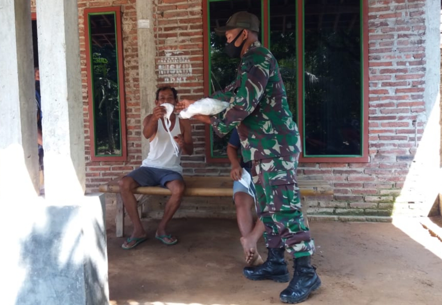Terlihat Sertu Joni Iskandar anggota Satgas TMMD Reguler Kodim Pati sedang memberikan masker gratis kepada keluarga Bapak Suparjo (64) warga Dukuh Pandahan, Desa Tamansari, Kecamatan Jaken, Kabupaten Pati