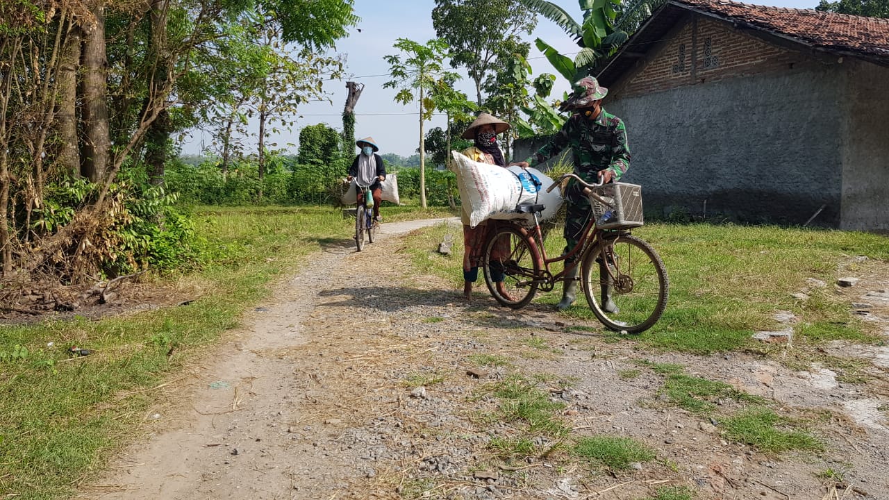 Pati – Ditengah perjalanan pulang selepas pekerjaan pada pengerjaan pembangunan jalan betonisasi diDesa Tamansari, Kecamatan Jaken, anggota satgas TMMD reguler 111 Kodim 0718/Pati mendapati warga yang kesulitan menaikkan karung berisi jerami untuk pakan ternak yang akan dibawa pulang menggunakan sepeda ontel. Kamis (06/07/2021)