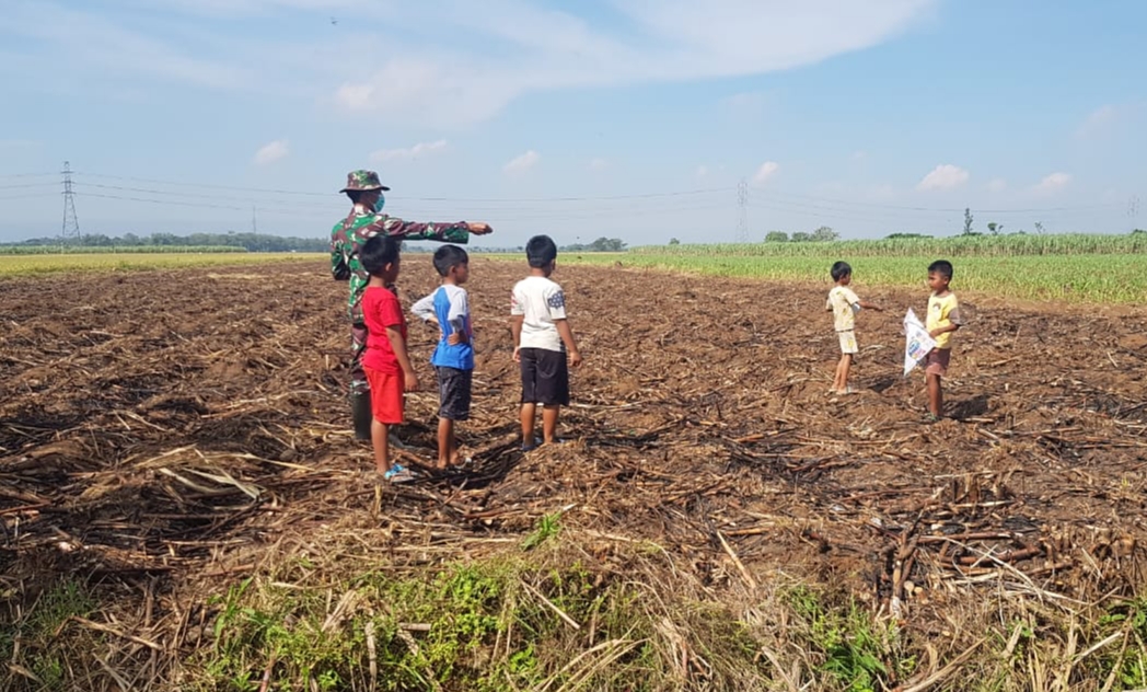 Seperti kali ini, Serda Sukarji anggota Satgas TMMD Reguler Kodim Pati sedang bermain layang-layang dilahan perkebunan tebu yang baru saja selesai di tebang. Serda Sukarji terlihat asyik bermain layang-layang bersama anak-anak Dukuh Pandahan, Desa Tamansari, Kecamatan Jaken, Kabupaten Pati,