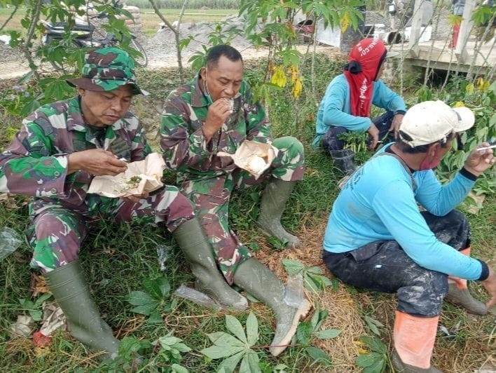 Pati – Kedekatan dan kebersamaan TNI dan masyarakat dalam menjalankan kegiatan Tentara Manunggal Membangun Desa (TMMD) ke-112 Ta. 2021 Kodim 0718/Pati, tidak hanya terlihat saat mengerjakan titik sasaran.Warga juga tidak sungkan makan bersama dengan para tentara. Hal ini tampak jelas terlihat saat istirahat makan siang disela sela pekerjaan TMMD di Desa Tamansari Kecamatan Jaken Kabupaten Pati, Jum’at 02/07/2021.