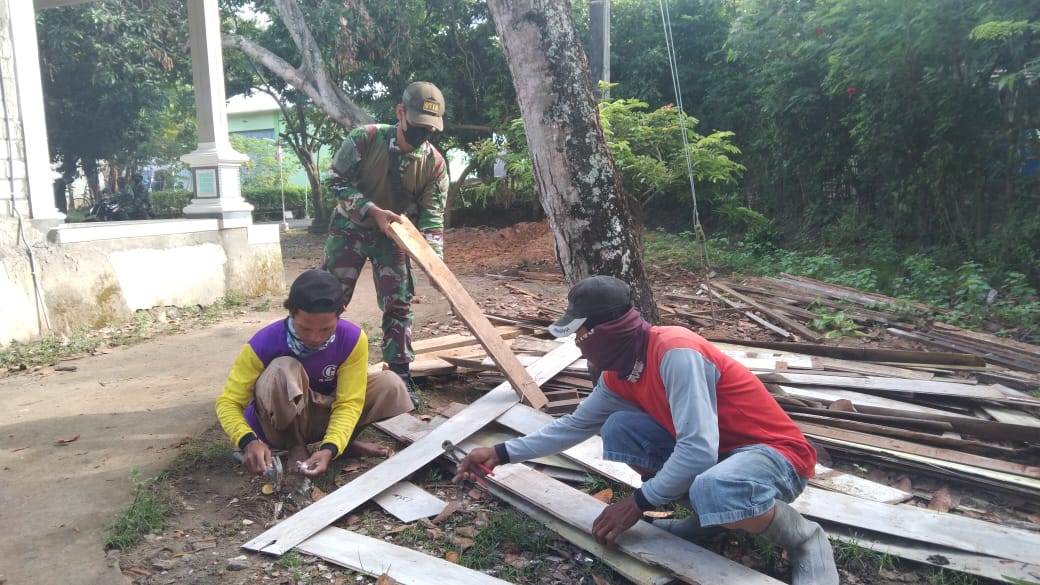 Terlihat Serda Sulistiyanto dan warga Suharto (50) sedang mencabut paku . Paku Yang Menempel di bekas bangunan supaya saat satgas dan warga bekerja terhindar adanya paku yang menempel di bekas bangunan . Yang dapat membahayakan para Pekerja selain itu bekas Paku yang masih bagus juga bisa dimanfaatkan .