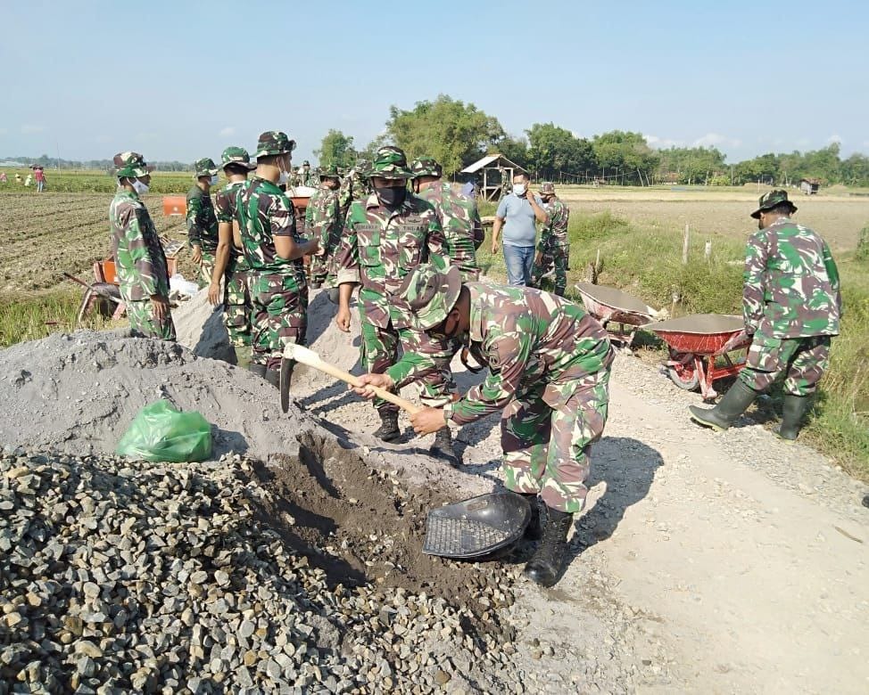 Pati – Anggota Satgas TNI dari kodim Pati dan masyarakat Desa Tamansari, Kecamatan Jaken, Kabupaten Pati, telah menuju ke lokasi TMMD reguler ke 111 TA. 2021 untuk melangsir dan mengangkat pasir, batu split, untuk melanjutkan pelaksanaan ‘pengecoran jalan supaya tidak terjadi keterlambatan bahan yang di aduk untuk pengecoran dan mendapatkan hasil yg maksimal.