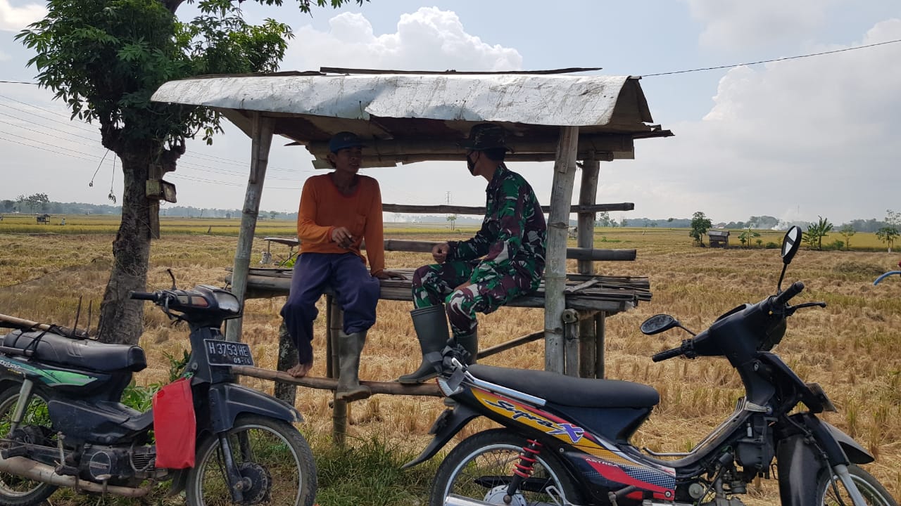 Saat istirahat sejenak sebagian dari mereka memilih berteduh digubuk sembari menikmati makanan ringan dan minum yang telah mereka bawa. Tampak terlihat Serda Mulyono anggota satgas TMMD bersama Karman (45) warga dukuh Pandahan, Desa Tamansari, Kecamatan Jaken sedang asik dalam obrolan ringannya tetapi penuh makna.