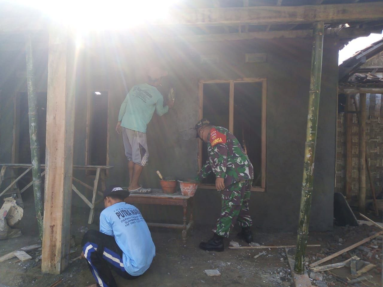 PATI – Dalam upaya mengejar target waktu penyelesaian program sasaran utama TNI Manunggal Membangun Desa (TMMD) ke-111 TA. 2021 Kodim 0718/Pati, yang terpusat di Desa Tamansari, Kecamatan Jaken, Kabupaten Pati, Satgas TMMD dibantu masyarakat Desa Tamansari bersama-sama mengerjakan penyelesaian plesteran dinding rumah pak Kasmo, (13/06/2021).