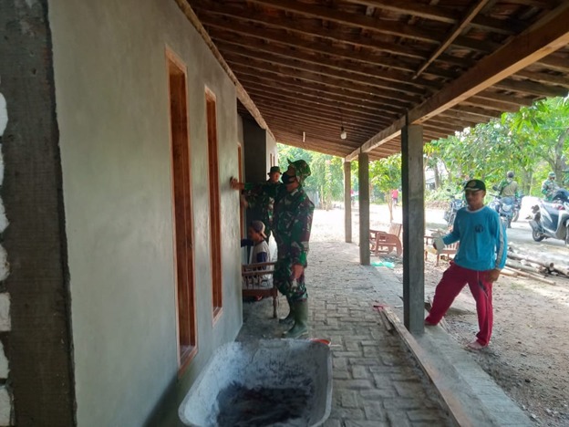 PATI – Dalam upaya mengejar target waktu penyelesaian program sasaran utama TNI Manunggal Membangun Desa (TMMD) ke-111 TA. 2021 Kodim 0718/Pati yang terpusat di Desa Tamansari, Kecamatan Jaken, Kabupaten Pati, Satgas TMMD dibantu masyarakat desa Tamansari bersama-sama mengerjakan penyelesaian Pengacian dinding rumah ibu Jarmi (53), Rabu (21/06/2021).
