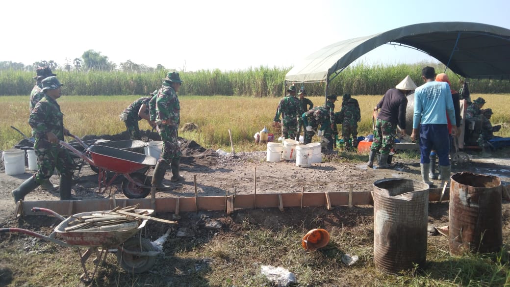 Pati – Semangat dan kompak rasa kebersamaan yang dilakukan oleh anggota satgas TNI Manunggal Membangun Desa ( TMMD ) reguler ke – 111 Kodim 0718/ Pati, Desa Tamansari,Kecamatan Jaken, Kabupaten Pati, pengerjaan pembangunan fisik berupa pengecoran jalan terus berjalan melawan waktu dan cuaca yang sering turun hujan dilokasi pengecoran,Jumat (25/06/2021).